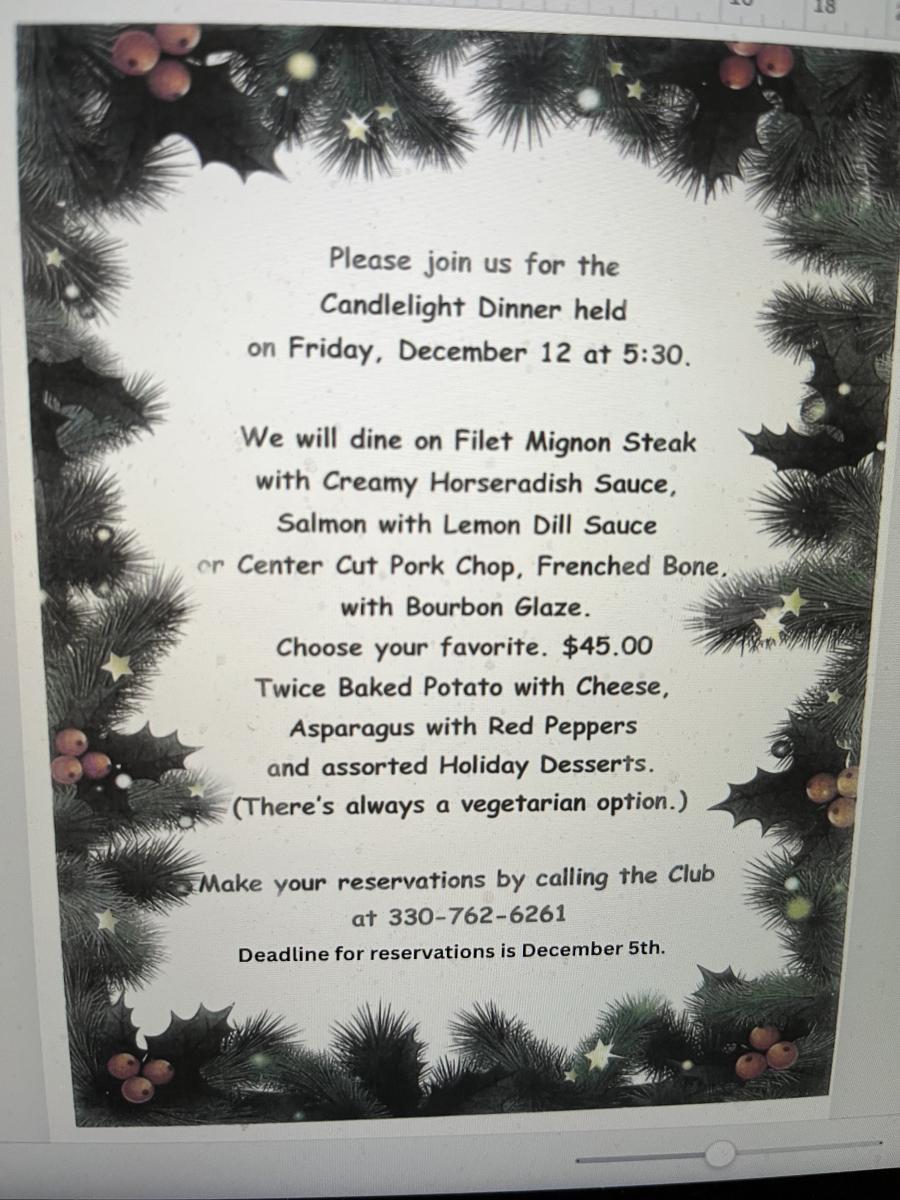 Candlelight Dinner: Friday, December 12th at 5:00.