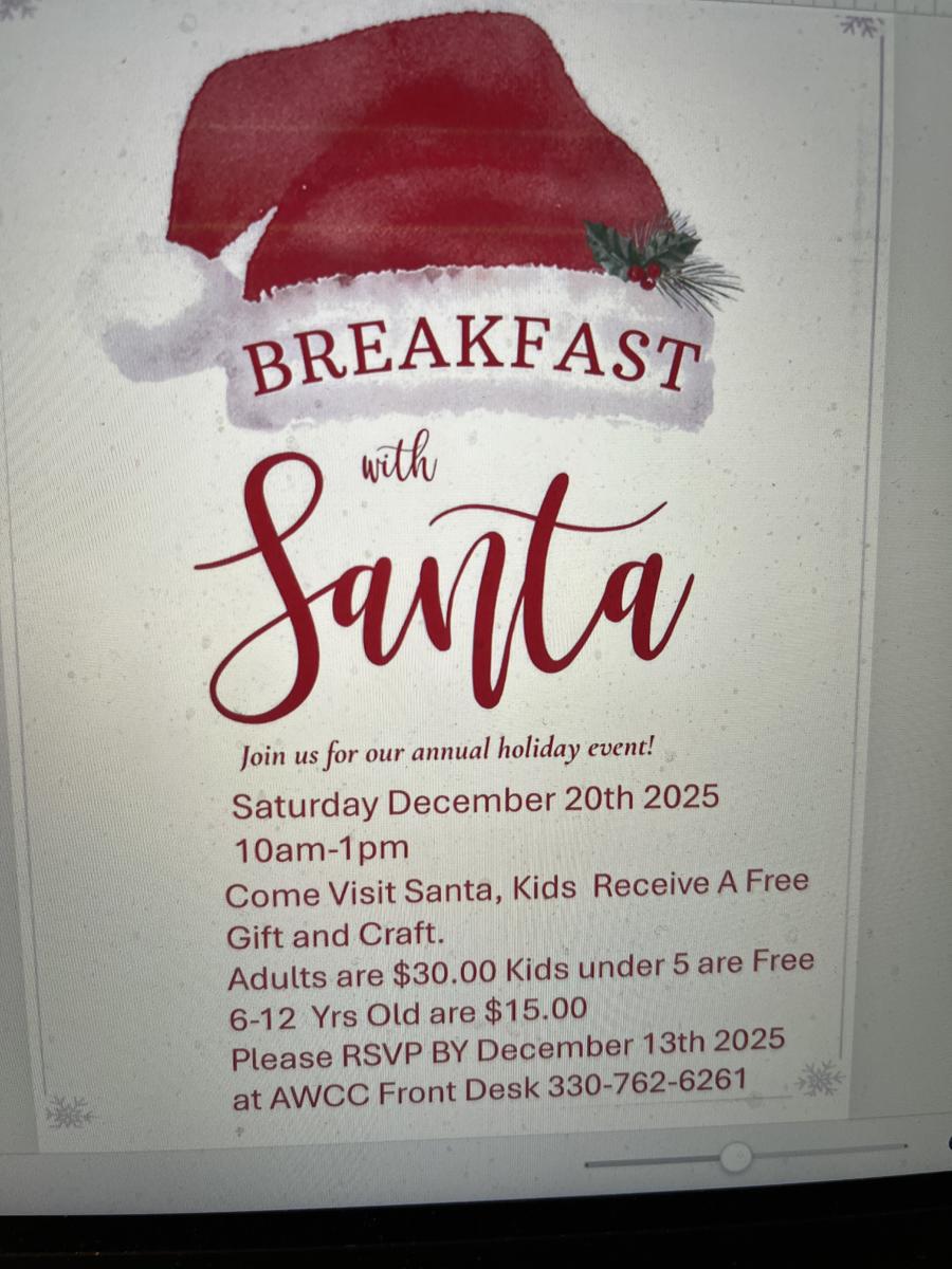 Breakfast with Santa: Saturday, December 20th from 10-2:00.